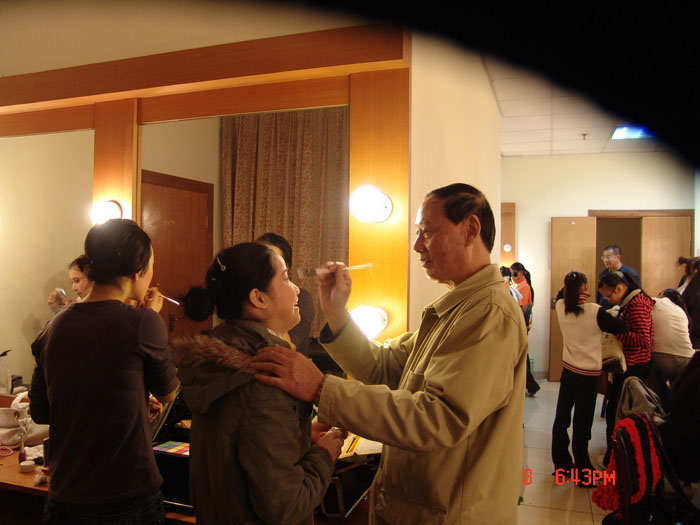 在剧场后台,最忙碌的要数戏剧科的老师,每个人都恨不能分成两个人甚至三个人来用。钱丽文老师一边给学生化妆,一边还不忘叮嘱学生带好参茶;俞会珍老师是当天彩排的“总调度”,一手拿着笔记本,一手拿着对讲机,顾不上身体不适,不停地前台后台现场指挥;而王莲萍老师,已经看不见她正常的走路,只见她一路小跑拉上几个学生练“扔抢”,随即又冲回来帮学生换服装,至于吃饭这事早忘得一干二净----