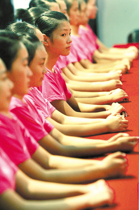 开学第一天,老师已给25个女孩做了规矩,以后要站如松,坐如钟,尤其是腰,坐着也要挺直,不许如糯米般粘在椅子上。开班典礼现场,有几个学生支持不住,偷偷靠在椅背上,马上有老师用笔捅她们的背,“坐直”。不仅坐姿、站姿,连发型也有要求,头发必须扎起来,露出额头,短得扎不进去的头发要用发卡别住。昨天很多女孩子头上密密麻麻别了10来个发卡,爱美的女孩悄悄在发卡上做文章,在头顶别一个金色的小蝴蝶……