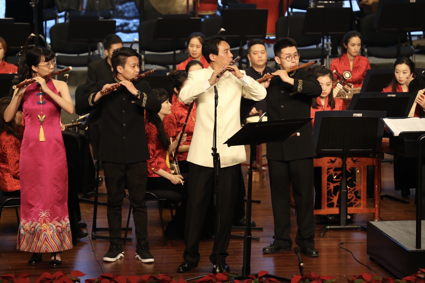 伴随着气势恢宏的民族管弦乐《松庭流芳》的奏响,音乐会拉开帷幕。该曲首演于2016年10月在浙江省人民大会堂举行的“松庭流芳”赵松庭纪念馆落成典礼音乐会,寓意着赵松庭的精神流芳百世,以此表达对先生高风亮节的景仰。笛曲《风袅袅》《王昭君》《皂罗袍·武场》《腾飞》《夏夜闻笛》《月落平湖》《江上清风》等一批由国内顶尖民乐作曲大师的最新力作悉数亮相,均为首次在舞台进行公演作品,一场民族音乐盛宴奏响于西子湖畔,为现场观众带来了连连惊喜。作为本场音乐会的核心人物,吴樟华饱含深情地演奏了7部作品,精湛的技艺征服了现场观众,数十年耕耘笛坛的深厚积淀在此刻全面绽放。音乐会压轴曲目是由赵松庭先生生前根据浙江婺剧乱弹唱腔中的同名曲牌改编而来的经典竹笛协奏曲《三五七》,由吴樟华领衔众多青年笛子表演人才共同奏响,场面热烈,寓意着中国笛乐的明天将更辉煌,告慰已驾鹤西去的先生。