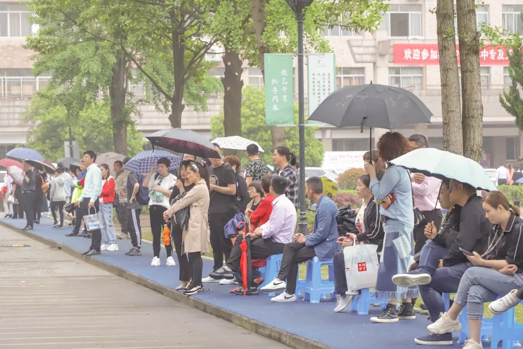 4月20日早上八点,学校附中楼、图信中心、音乐楼陆陆续续来了许多考生与家长,考生有序排队进场,家长们守候在外。天空飘起了雨滴,许多家长撑着伞等候,寸步不离。
