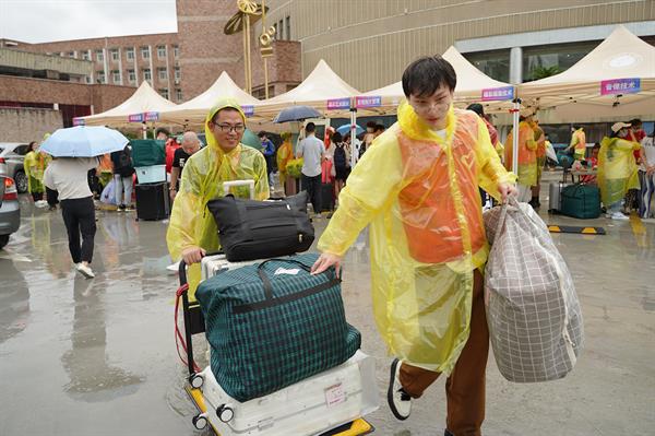 在濛濛细雨中,校领导来到报到现场关心慰问新同学并鼓励同学们:希望21届新生们好好利用大学时光,学有所成,学有所用。并且能在大学交到新的朋友,和老师融洽相处,处理好人际关系,度过美好的三年大学时光。