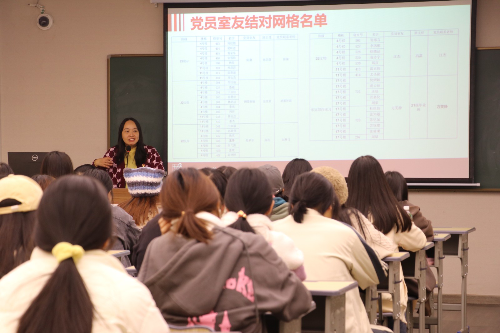 会议伊始,陈琳公布寝室网格长名单以及党员室友结对网格名单。她表示,寝室网格长为寝室管理第一负责人,党员室友是良师亦是益友,应与其加强沟通,积极配合,将寝室网格化管理落到实处,共同建设文明安全的寝室环境,以“一个沟通方式”“一次知心谈话”“一场师生活动”“一堂生动党课”等形式开展共建共促活动。